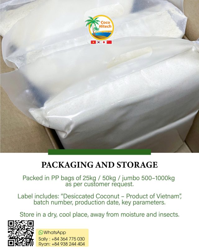 Label includes: “Desiccated Coconut – Product of Vietnam”, batch number, production date, key parameters.